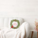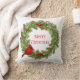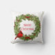 This holiday pillow is shown with a festive Christmas holiday berry wreath and cardinal print.