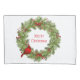 This holiday pillowcase is shown with a festive Christmas holiday wreath and cardinal bird print.