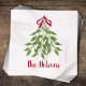 Merry Mistletoe with white berries tied up in a red ribbon nestled atop a doorway awaiting those to stand underneath. A lovely and simple design that depicts a simple and classic Christmas element. A wonderful design for any holiday occasion.