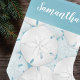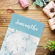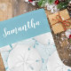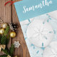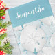 This design features a Christmas holiday turquoise blue cute stocking with a stylish trendy calligraphy script, a festive cute simple minimalist style, a creative unique cool coastal nautical, a beach tropical ocean sea seashells, a white sand dollar crustacean aquatic, a family vacation trip keepsake, a beach house cottage home décor, holiday Christmas beach home décor, a Christmas holiday tropical decoration
