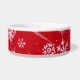A design hand drawn with a pen and ink in a bright and cheery red color. Unique snowflakes of varying sizes overlay a subtle sunray pattern.