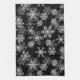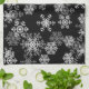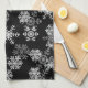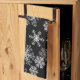 Kitchen towel is shown in a black color with a holiday Christmas snowflakes print.