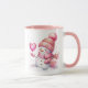 This ceramic coffee mug is shown in a festive holiday pink snowman print.