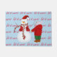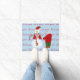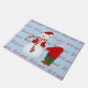 This holiday doormat is shown with a festive holiday Christmas snowman print on a blue background color.