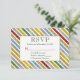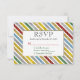 An elegant RSVP card featuring a fun gold, silver and blue, red and green faux glitter metallic stripe background.