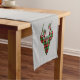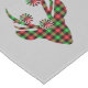 Holiday table runner is shown with a festive deer head print in a green and red plaid.
