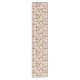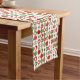 This holiday table runner is shown with a festive Christmas trees and snowflakes print.