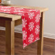 This Christmas holiday table runner is shown with a red background color and has a festive Christmas snowflakes print design.