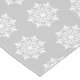This Christmas holiday table runner is shown with a silver background color and has a festive Christmas snowflakes print design.