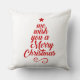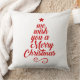 This throw pillow is shown in a festive Christmas tree wish print design.