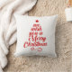 This throw pillow is shown in a festive Christmas tree wish print design.