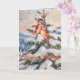 Holiday winter greeting card with a painting of a pine tree covered with snow and two bright red colored birds.