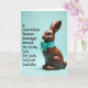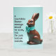 This card features a sleek chocolate-brown bunny figure on the right, shaped like a hollow treat, with smooth highlights along its long ears and rounded body 🐰. A cool teal ribbon is tied in a tidy bow around its neck, adding a gentle romantic touch, like a small gift meant for someone special 🌷. The background is a calm aquamarine field that keeps the focus on the bunny and gives the scene an airy, modern look. On the left side, a black message is set in a slightly retro type style, spaced neatly so it feels balanced against the bunny. The text reads, “A heartfelt Easter message would be nice, but I’m just hollow inside,” with the line breaks arranged to fill the left half without crowding. The contrast between the sweet-looking bunny and the dry, honest wording creates a friendly, teasing mood, like an inside joke shared between close friends. A soft shadow sits under the bunny, anchoring it to the surface while the teal bow stands out sharply against the rich brown.