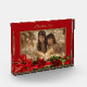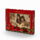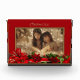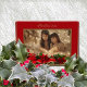 This design has a spacious place for your family photo. Across the bottom is a large spray of red poinsettias and ribbon, accented with gold edging. Above picture is your text. The burgundy color is rich, as well as traditional. It is a tribute to the well-known Christmas song, “The Holly and the Ivy”. Send a gift that is beautiful, and lasts!