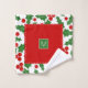 Holly berry pattern and red scalloped borders Christmas Bath Towel Set. These towels are adorned with a charming holly berry pattern and have elegant red scalloped borders. The bath towel showcases the festive holly berry pattern and features bands on the short sides with scalloped edges. Additionally, there is a lovely frame where you can personalize it with your family name. The hand towel is also beautifully designed with a scalloped border, adding a touch of elegance. The wash cloth, on the other hand, is in a vibrant red color in the center, surrounded by a delightful holly berry border and it has your monogram.