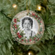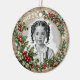 A vintage style holly frame for your custom photo, with custom commemorative text on the other side, on this round ceramic Christmas tree ornament.