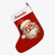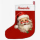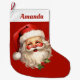 Personalized Christmas stocking with a joyful illustration of a vintage style Santa Claus with red rosy cheeks. Wearing his classic red Santa hat and his big white beard. A sprig of holly adds to the festive holiday spirit of this design.