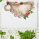A kitchen towel with a joyful illustration of a vintage style Santa Claus with red rosy cheeks. wearing his classic red Santa hat and his big white bear. A sprig of holly adds to the festive holiday spirit of this design.