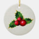 Brighten up your Christmas tree and give a touch of warmth and excitement of the holidays to your Christmas decoration with this simple yet charming circle ceramic Christmas ornament. Featuring a lovely Christmas Holly Mistletoe print, set against an Ivory off-white texture background, this charming ornament is a perfect way to commemorate the holiday season with your family and makes a great gift for all of your loved ones. Personalize it with your own wording.
