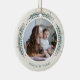Festive photo Christmas ornament features a favorite photo on each side, framed by colorful pine boughs and holly berries on a soft ivory background. Personalize with a custom caption on each side; shown with names and the year.