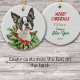 On the front of this Holiday ornament is an image of an adorable black and white Boston Terrier dog looking out from a holly leaf and red berry bouquet. The back of the ornament has your custom text in red, gold and green. Make it say whatever you'd like!