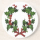 Round cork-backed sandstone coaster with a vintage image of two sprigs of holly with red berries tied together at the bottom with a red satin bow to form a wreath. See matching square plastic coaster and round paper coaster. See the entire Christmas Coaster collection under the HOME category in the HOLIDAYS section.
