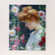 Puzzle features 'Hollyhocks and Sunlight' (1902) by Charles Courtney Curran. Originally an oil-on-canvas painting, the artwork features a red-haired woman among red, pink, and white hollyhock flowers in a Valentine color scheme. The young woman's ginger hair is in an updo, and she wears a white dress.