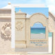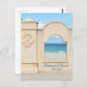 Ocean view from the Hollywood Beach Florida Broadwalk on a photographic tourism postcard. Looking through a window in the wall along the boardwalk, you can see the the sandy beach and the different shades of blue water and sky and just a hint of colorful beachgoers with their chairs. This is original seashore photography by JLW_PHOTOGRAPHY.