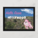 The Hollywood California Retro Pink Poodle Postcard features the famous Hollywood sign and a glamorous retro pink poodle in sunglasses. The front of the card reads "Hello From Hollywood"
