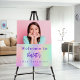 A welcome sign for a 18th (or any age) party. Holographic background in purple, pink and mint green. Personalize and add your own high quality photo of the birthday girl. The text: The name in purple with a modern hand lettered style script. Tempates for a name.