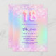A girly and feminine 18th birthday party invitation. On front: A rainbow, holographic colored background in purple, pink, mint green. Decorated with blush pink confetti. Personalize and add a name and party details. The name is written with a hand lettered style script, purple colored letters.