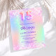 A girly and feminine Quinceañera party invitation. On front: A rainbow, holographic colored background in purple, pink, mint green. Decorated with blush pink confetti. Personalize and add a name and party details. The name is written with a hand lettered style script, purple colored letters.