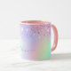 A trendy holographic background with unicorn and rainbow pastel colors in pink, purple, mint green. Decorated with purple faux sparkles. Personalize and add a name, written with a modern hand lettered style script with swashes. Purple colored letters. To keep the swashes only delete the sample name, leave the spaces or emoji's in front and after the name.