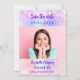 A modern and elegant Save the Date for a Sweet 16. Holographic, pink, purple background with confetti. Personalize and add a photo, date and name.