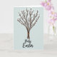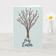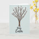 This card features a simple bouquet of early-spring branches, their brown stems gathered and fanning upward with small oval white buds like soft catkins 🐇. A warm brown tie wraps the stems near the base, giving the arrangement a cozy, shared-gift feel, like something picked together on a morning walk. The background is a muted sky-blue that reads like cool air and open space, letting the branches stand out without fuss. The white buds look gently textured against the smoother stems, adding a quiet contrast that feels tender and close, as if meant for a dear friend or someone you’re sweet on 🌷. Near the bottom, the words “Holy Easter” sit centered beneath the bouquet. The lettering is a flowing, handwritten-style line in a darker brown, sized to balance the image without crowding it. The overall palette stays with soft blues, browns, and whites, and the buds dot the upper stems in neat clusters against the blue field.