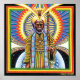 In this acrylic painting by Chris Dyer, a holy man stands over the world with his staff in hand.