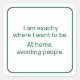 This sticker is a vibe. Use it to declare your preference for peaceful solitude. Dark green text says, "I am exactly where I want to be. At home, avoiding people." Other available colors include hot pink, dark blue, dark red, and black.