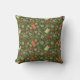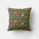 Throw pillow featuring lovely pattern, sewing supplies - scissors, buttons, spools of thread, needles - scattered on olive green background. This design, elaborated from handmade paper collage, makes a great gifts for crafters and sewers.