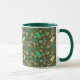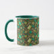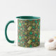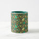 Coffee Mug featuring lovely pattern, sewing supplies - scissors, buttons, spools of thread, needles - scattered on dark green field. This design, elaborated from handmade paper collage, makes a great gifts for crafters and sewers.