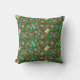 Throw pillow featuring lovely pattern, sewing supplies - scissors, buttons, spools of thread, needles - scattered on dark green field. This design, elaborated from handmade paper collage, makes a great gifts for crafters and sewers.