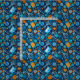 Fabric features cute home hobbies pattern, sewing supplies - scissors, buttons, spools of thread, needles - scattered on dark blue background. This design, elaborated from handmade paper collage, makes a great gifts for crafters and sewers.
