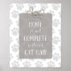 Scrapbook style typography poster with the phrase, "HOME is not COMPLETE without CAT HAIR." Faux ribbon and button on a background that has gray animal paw prints. Designed by Rycky Creations; elements from Pixelscrapper.