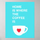 A white coffee mug with a red heart, is on a turquoise background. The saying "home is where the coffee is" reminds us that as long as there's coffee, there's something to be thankful for!