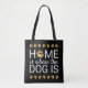 Enjoy this cute and funny graphic tote bag featuring the words "home is where the dog is" in modern script typography including a metallic gold foil paw print for the "o" in "home" and walking paw prints over a black background.