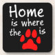 A wordplay with the quote "Home is where the heart is", this black hard plastic coaster has the words "Home is where the [paw print picture] is", with the paw print picture in red, representing the "heart". The perfect gift for pet lovers.