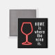 Funny fridge magnet has neon red wine glass outline with "home is where the wine is" text on black background.