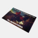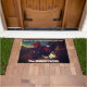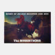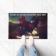 A red and black rooster makes some noise while a white hen sits nearby. The text reads, "Home of an old rooster and hen."