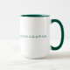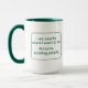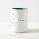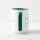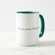 White, 15-ounce, mug with dark green handle and interior. Matching green text says, "I am exactly where I want to be. At home, avoiding people." A decorative scribble runs around the back of the mug to complete the design. Created with right-handed people in mind.