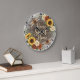Infuse your living space with the high-energy warmth of a summer garden with the Home Sweet Home Dragonfly Floral clock. This charming timepiece features a stunning high-definition graphic set against a rustic, weathered wood-plank background. The design is beautifully accented by vibrant sunflowers, delicate white roses, and rich copper-toned dahlias, with sprigs of lavender adding a touch of elegance. Two intricately detailed dragonflies glide across the face, flanking the graceful "Home Sweet Home" script in the center. While the artwork perfectly captures the natural textures of aged timber and organic flora, this is a durable high-definition graphic application on a premium clock face. It is a prestigious and welcoming addition to any kitchen, entryway, or sunroom.