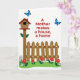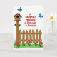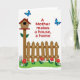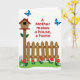 This greeting card features a digital illustration on a white background, where a large crimson line of text reading “A Mother makes a house, a home,” sits prominently near the top as the main focal point. Just above and around that wording, two airy blue butterflies drift across the open space, their soft wing shapes adding a gentle, affectionate touch ❤️. Beneath the text, a cozy birdhouse with a warm brown body and a red roof stands on a slim wooden post, like a small place made safe by care. A dark circular entrance marks the front of the birdhouse, and a pair of green leaves near the base adds a quiet, welcoming note 🌼. Along the lower area, a simple brown picket fence stretches across the scene, giving the picture a sheltered, “look after you” feeling through its even, orderly boards. Under the fence, a strip of green grass holds clusters of stylized flowers in red and white with deep green foliage, as if the garden has been lovingly tended. The red roof, brown fence, and red-and-white blooms sit in a neat row along the bottom edge beneath the butterflies.